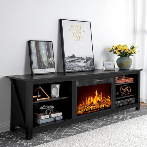 Overall Dimensions: 70" W x 25" H x 15.6"D. For flat curved screen TV up to 80 inches. Electric fireplace: 23"x17.5".
