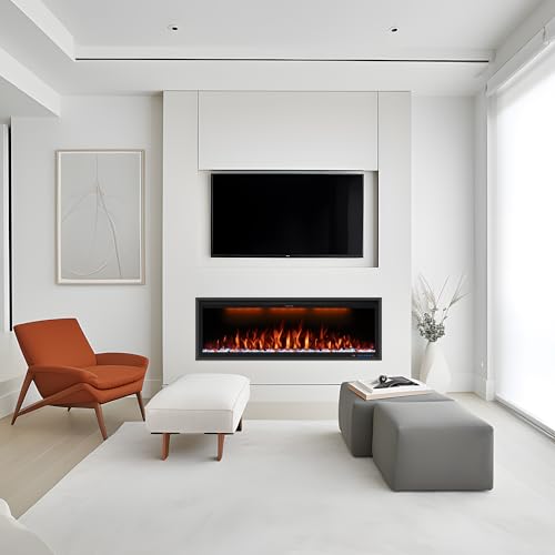 ?Available Installations: Electric fireplace heater is created for recessed & wall mounted installation. Insert size: 72.5"*15.75"*5.91", Overall size: 74.02"*16.87"*6.31". Premium black metallic body with a glass LED display screen and crystals and logs made of resin material create a unique and stylish design