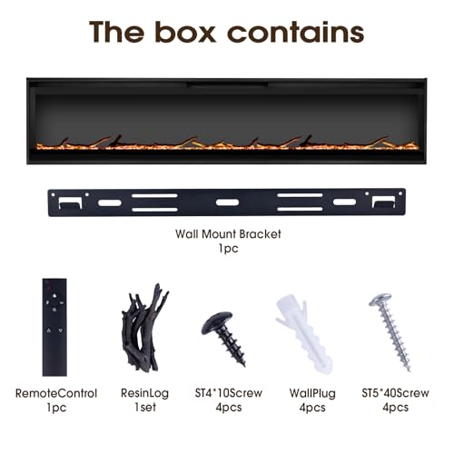 The box contains: fireplace body * 1pc, RemoteControl * 1pc, Resin Log * 1set, ST4*10Screw * 4pcs, (ST5*40Screw) * 4pCS, Installation Manual * 1pc