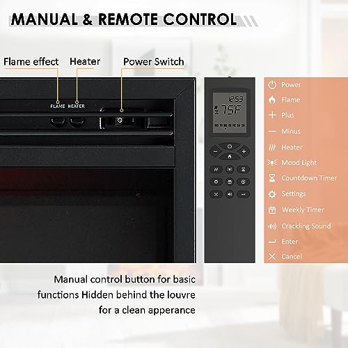 The quiet heater features a safe element and could heat up to 400 square feet. Built-in timer allows you to set the fireplace up to 9 hours.