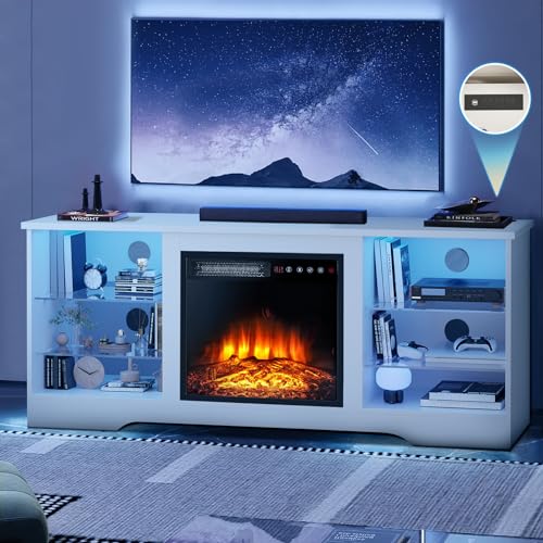 ?TV Stand with Electric Fireplace? The TV stand perfectly combines a 58 inch TV cabinet with an 18 inch electric fireplace. It can heat rooms up to 350 sq. ft and can be chosen from 5 temperature settings (65°F to 95°F),also includes a 1-8 timer. The 3D realistic flame effect can be operated with or without heat to create a warm atmosphere. The flame can not be changed color, but it can be changed brightness,from L1 to L5 level. It is equipped with digital LED display and remote control, can be operated remotely or by the button attached to the fireplace. Conveniently and easily to understand.