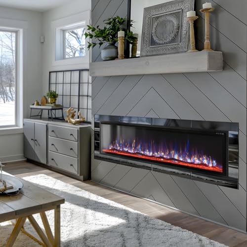 ?Multiple Installation Styles?The 72 inch electric fireplace's dimensions are 72"W*19.3"H*5.55"D. Both wall mounted and recessed installation styles are convenient. The wall fireplace's ultra-thin design with a narrow black frame, sturdy structure, and flat tempered glass front panel make it save space maximally. The versatile wall mount fireplace comes with easy-to-follow instructions to help homeowners install the floating/recessed fireplace