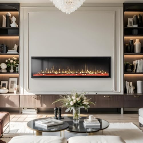 Realistic & Attractive Flame with 84 Color Combinations: This 50 inches electric fireplace support 12 carbon bed colors and 7 mixed flame colors, 5 flame speed modes and 5 flame brightness levels. Faux fire logs, driftwood and crystals all included in the set, which create a more authentic atmosphere