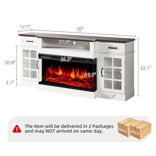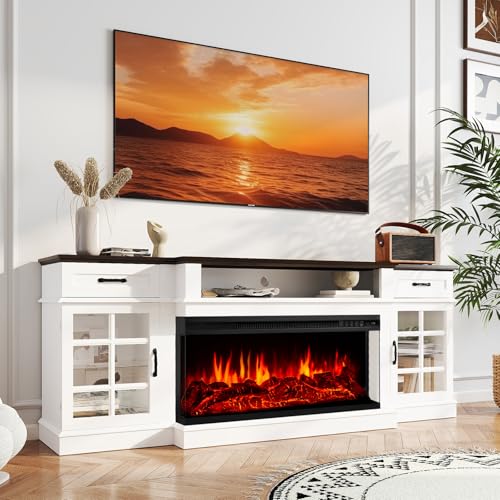 oneinmil 70" White TV Stand with 3-Sided Glass Electric Fireplace, Dual Cabinets & Two Drawers, Modern Entertainment Center with Adjustable Glass Shelves for Living Room