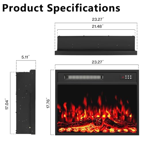 Efficient Electric Fireplace: This 23 inch electric fireplace insert can be placed wherever warmth and a cozy atmosphere are desired. Fireplace heating covers 400 square feet, so every corner of your room will be filled with warmth. Dimension: 5.24"D x 23"W x 17.7"H