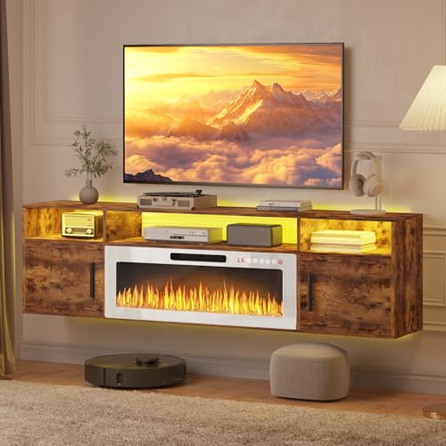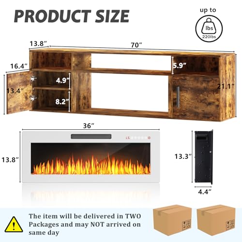 Unique Floating Design: This fireplace TV stand combines a 70 inch floating TV stand with a 36 inch electric fireplace, making this TV stand a entertainment center. The high-gloss finish is water-resistant and easy to clean. Made of solid wood, the sturdy construction ensures that the TV stand is strongly supported to maintain its longevity. The height of the TV stand hanging on the wall can be adjusted at will.