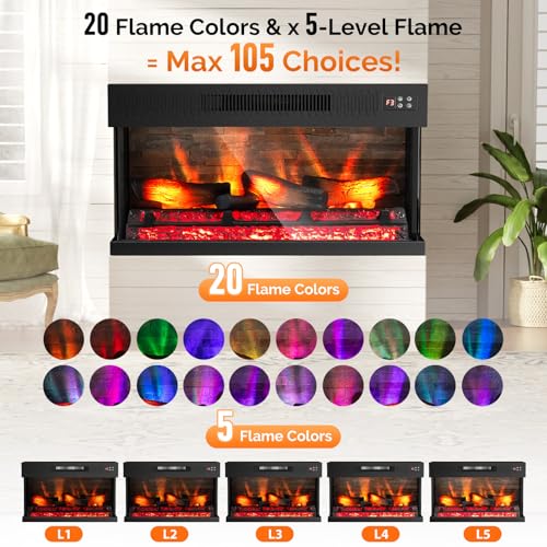 ????Breathtaking 270° Realistic Flame Effect: Enjoy the mesmerizing ambiance of a real flame electric fireplace from 3 sides of glass! With 20 flame colors and 5 brightness levels, create 105 custom looks to match your mood. Flame mode can be running seperatly, perfect as a stunning indoor fireplace year-round