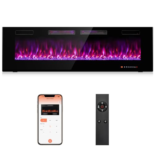 Multiple Control Options: Control your electric fireplace using the touch panel or remote control with a 26-foot effective range. Be sure to activate the main power button before use. By connecting the Smart Life app through Bluetooth, you can remotely control the electric fireplace with your smartphone. Efficient Heating: Choose between two heating options (750W/1400W) with this 5100 BTU electric fireplace that can warm rooms up to 400 square feet. Customize your comfort by using the flame and heat functions separately or together. Additionally, the two air inlets in front of the fireplace ensure swift air circulation. Beauty and Functionality Combined: This ultra-thin electric fireplace offers 12 flame colors, 12 ember bed colors, five levels of flame brightness, five levels of flame speed, and decorative crystals, creating a realistic and romantic ambiance. It is an ideal addition to your living room, entertainment center, or bedroom. Considerate and Reliable Design: Activate sleep mode by long-pressing the “DIMMER" button for six seconds for quiet operation that won't disturb you at night. The timer function can be set from one to 12 hours for a comfortable sleep environment. Additionally, ETL certification and overheat protection ensure safe usage. Two Installation Options: This electric fireplace can be recessed into the wall or wall-mounted using the preinstalled mounting bracket. Ensure the air outlet is not covered and maintain at least an 8-inch clearance around the fireplace.