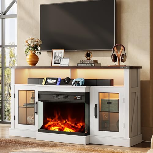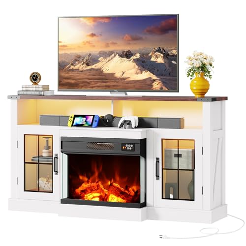 ??????Sturdy & Easy to Clean?This white TV stand with fireplace is made of high-quality wood particle board with a 3" thickened base for stability. The waterproof wooden top resists stains - just wipe spills away in seconds!