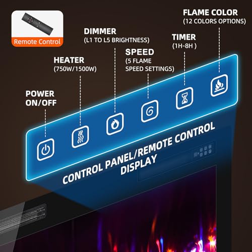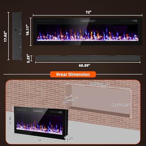 Ultra-Thin & Narrow Bezel Design – The Zionheat electric fireplace boasts a sleek 3.2-inch ultra-thin profile and a barely-there bezel, designed for seamless wall-mount or recessed installation. Framed in robust steel and tempered black glass, it integrates effortlessly into any decor—delivering modern warmth without compromising style Powerful Heating Capacity – This ETL-certified 72 inch fireplace delivers 5100 BTU of warmth, efficiently heating up to 900 sq. ft. Ideal for supplemental zone heating, it features three heat settings (Fan/750W & 1500W), allowing you to customize comfort while maintaining energy efficiency Realistic HD Flame Effects – Experience a major upgrade with high-definition flames that are more vibrant and expansive than ever. Choose from 12 LED-powered color modes and customize brightness and speed to set the perfect mood—with or without heat—for captivating ambiance all year Easy Remote & Panel Control – Adjust flame colors, brightness, heat, and timer with the remote or front panel. The cool-to-the-touch surface ensures safety, while the simple design makes operation effortless Easy Installation Requirements – Designed for simple wall-mounted or recessed installation, this fireplace includes all necessary hardware and clear step-by-step instructions. No venting or gas lines required—just plug into a standard electrical outlet for instant warmth and ambiance Enhanced Safety & Warranty – Featuring cool-to-the-touch glass, an automatic shut-off timer, and overheat protection, this fireplace ensures a safe experience for homes with kids and pets. Plus, enjoy peace of mind with our 1-year manufacturer’s warranty, protecting your investment